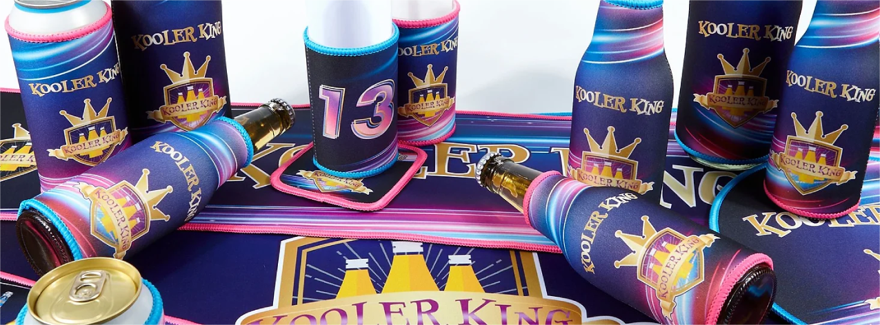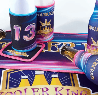 Custom Neoprene Beer Bottle Cover logo items for your business, Bar runners and Bar mats, Coasters, Check Bin and more. All Neoprene and custom printed. Made in Thailand for Thailand.